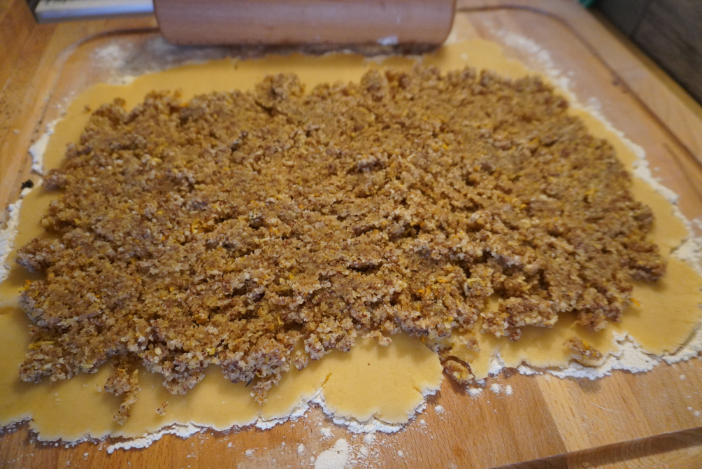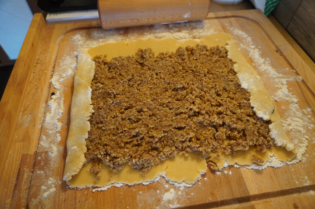 A bejgli tésztát egy lisztezett deszkán vékonyra kinyújtom téglalap alakúra.