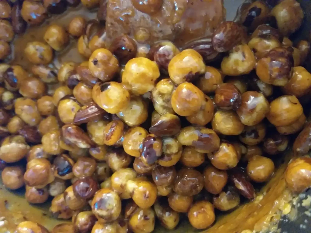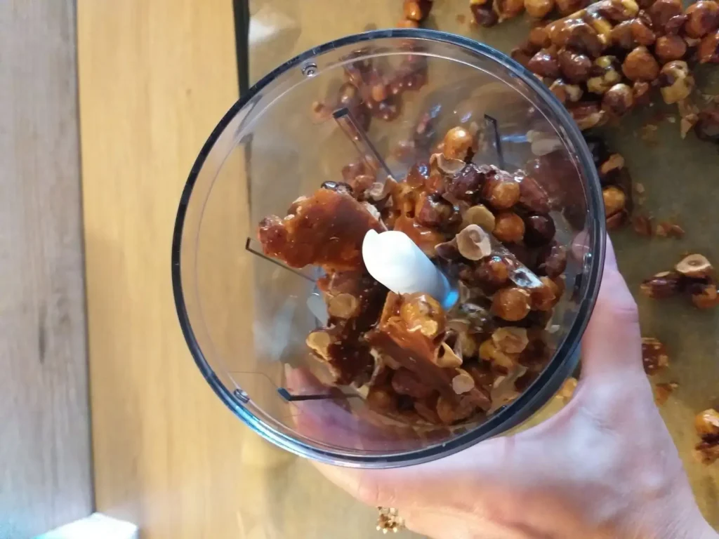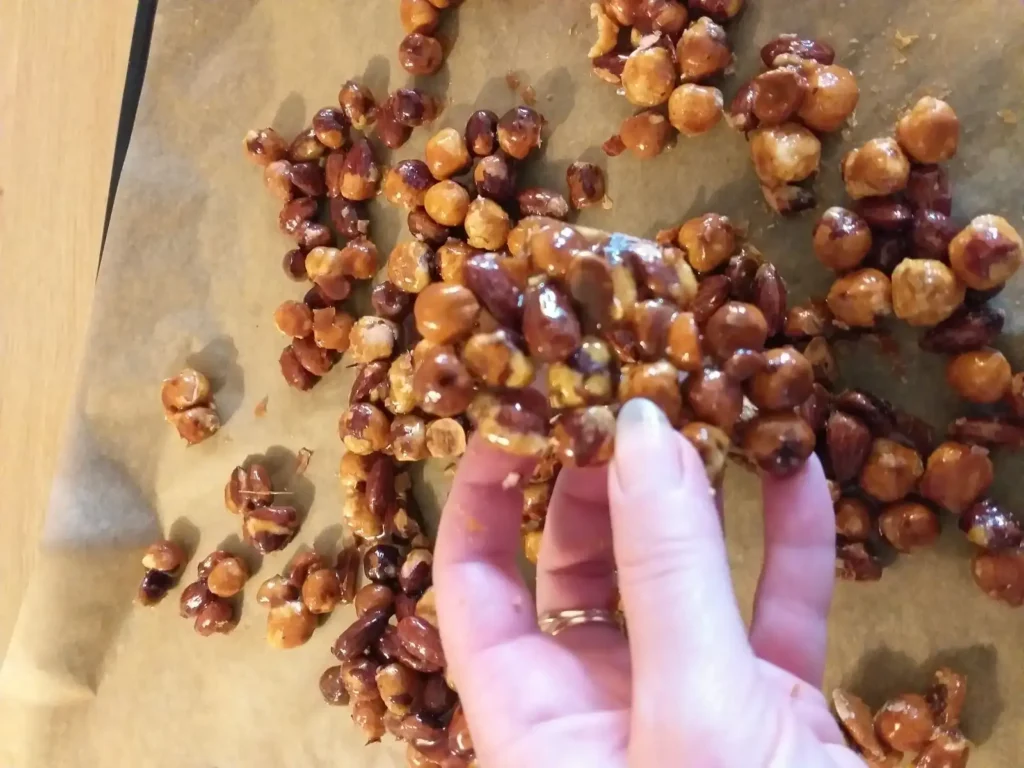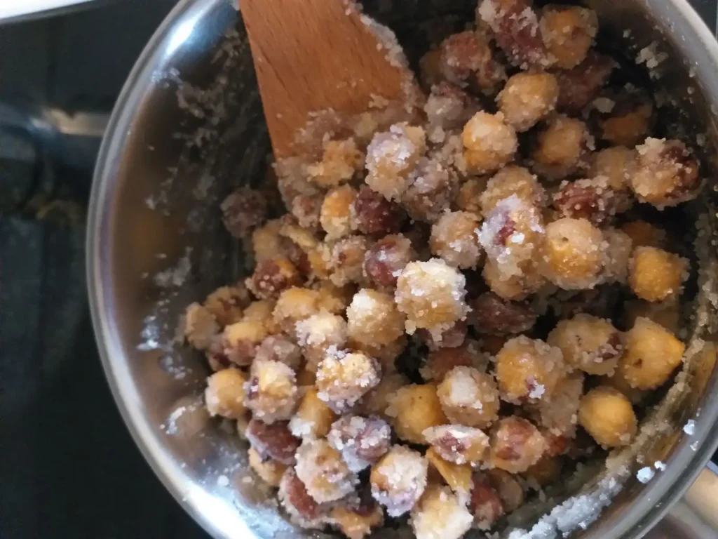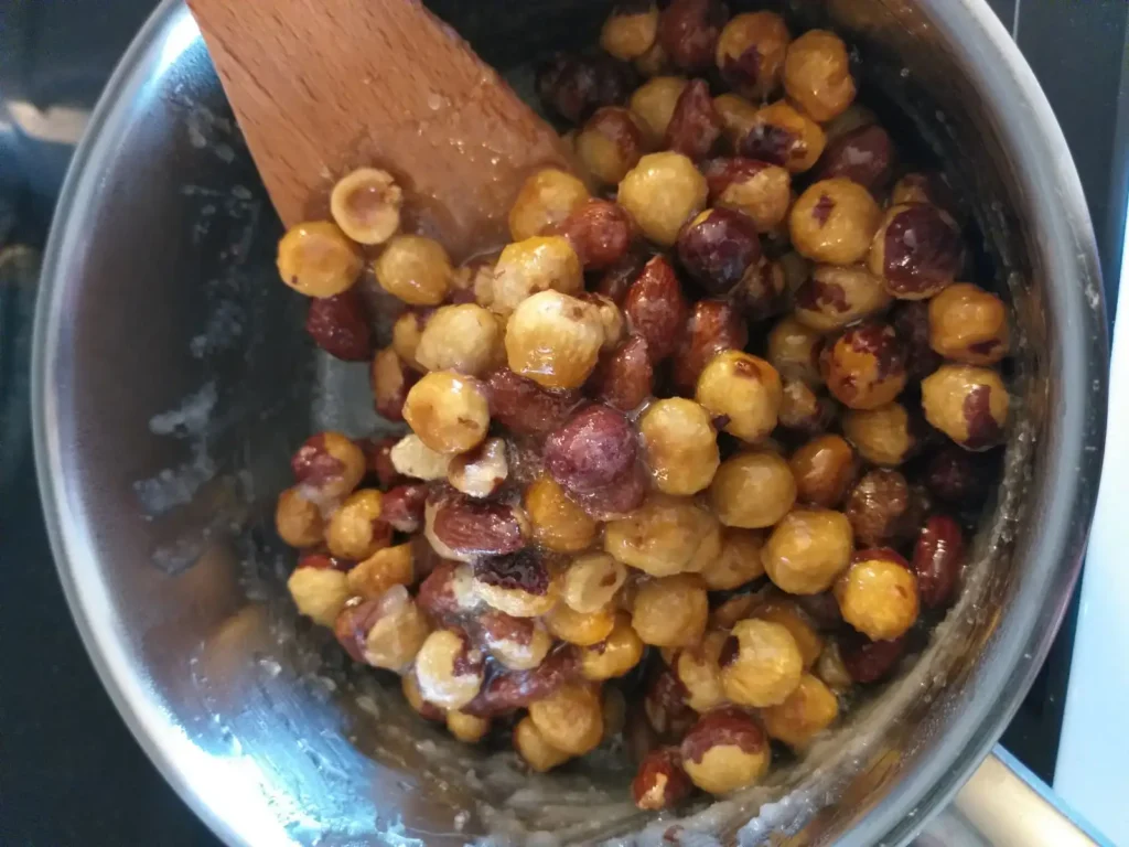 Amikor eléri a 120°C-t , hozzá adom a mogyorókat.