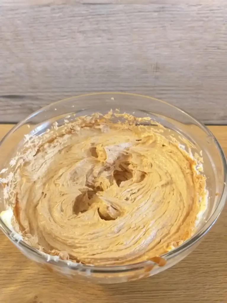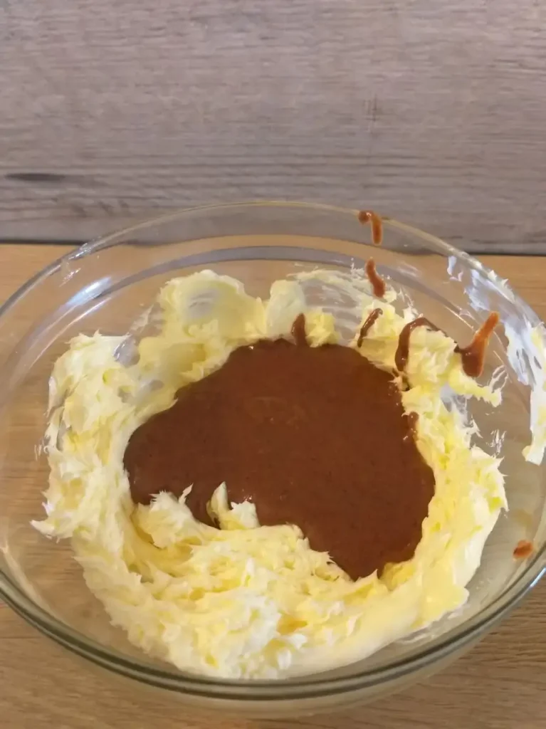 Míg hűl, a 140g szobahőmérsékletű vajhoz hozzá adok 140g pralinét.