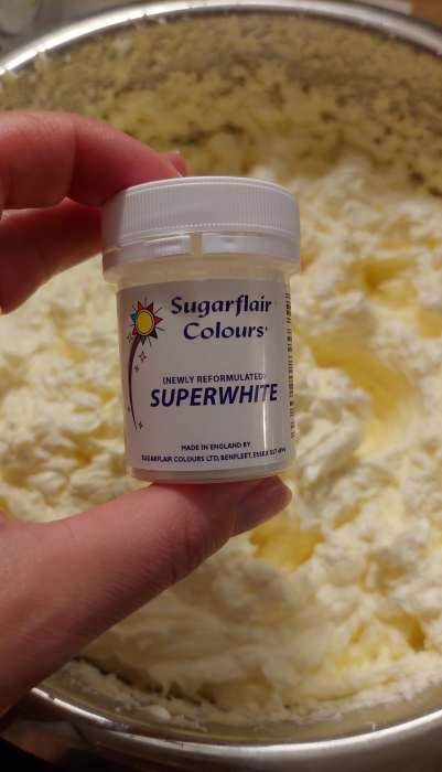 A szépen kihabosított vajkrémhez kevertem egy keveset a fehérítő porból.