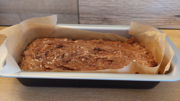 A sütőformát zsírpapírral kibélelem és bele öntöm a piskótatésztát.