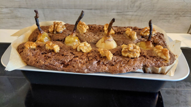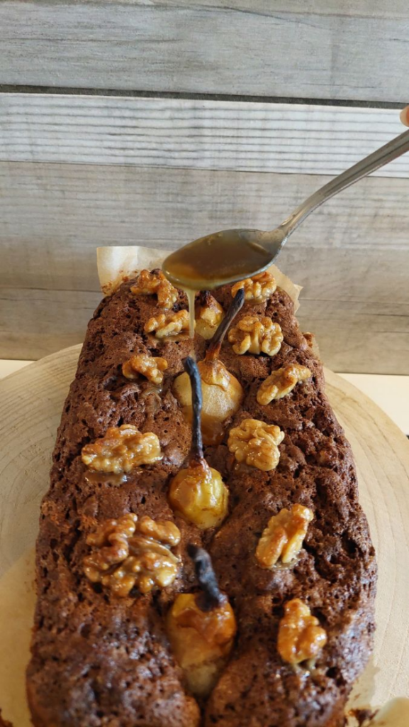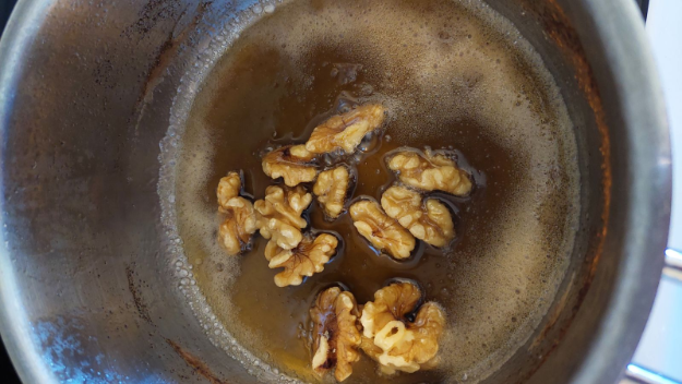 a karamelizált diókat a süti tetejére teszem és vissza tolom a sütőbe.