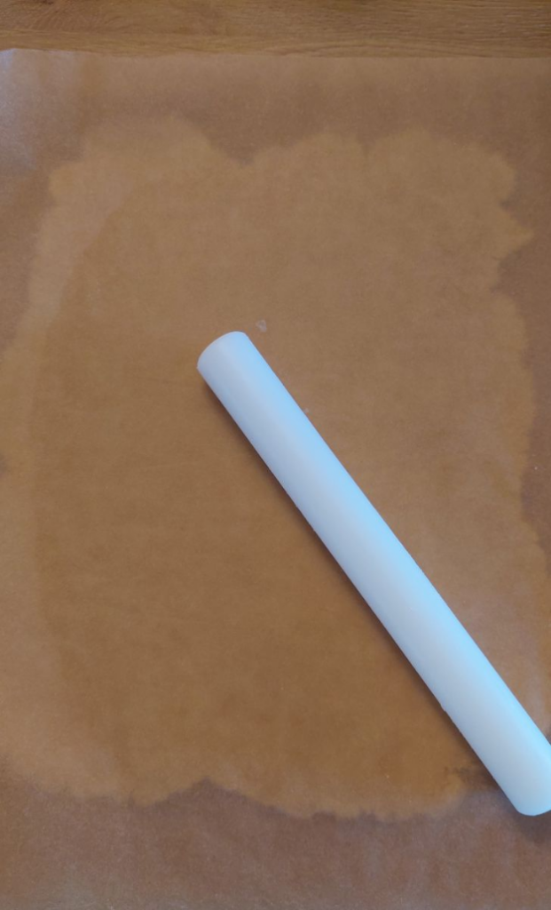 A gluténmentes, rízslisztes tésztát két sütőpapír közt nyújtom el, hogy könnyebb legyen vele a munka.