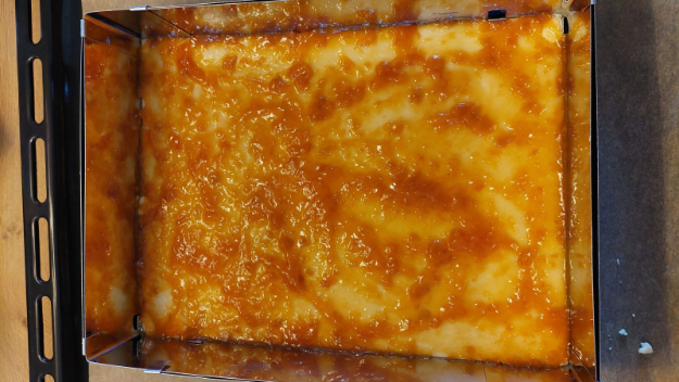 A tepsibe helyezett tésztát megkenem házi baracklekvárral
