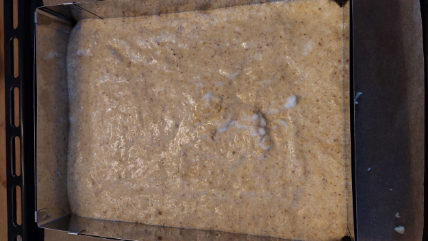 A tészta 3/4 részét bele nyújtom egy tepsibe, vagy sütőkeretbe (24cm x 35cm sütőkeretet használtam)