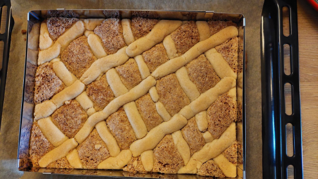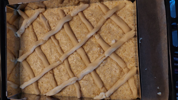 A maradék tésztából rácsokat sodrok és berácsozom vele a sütit.