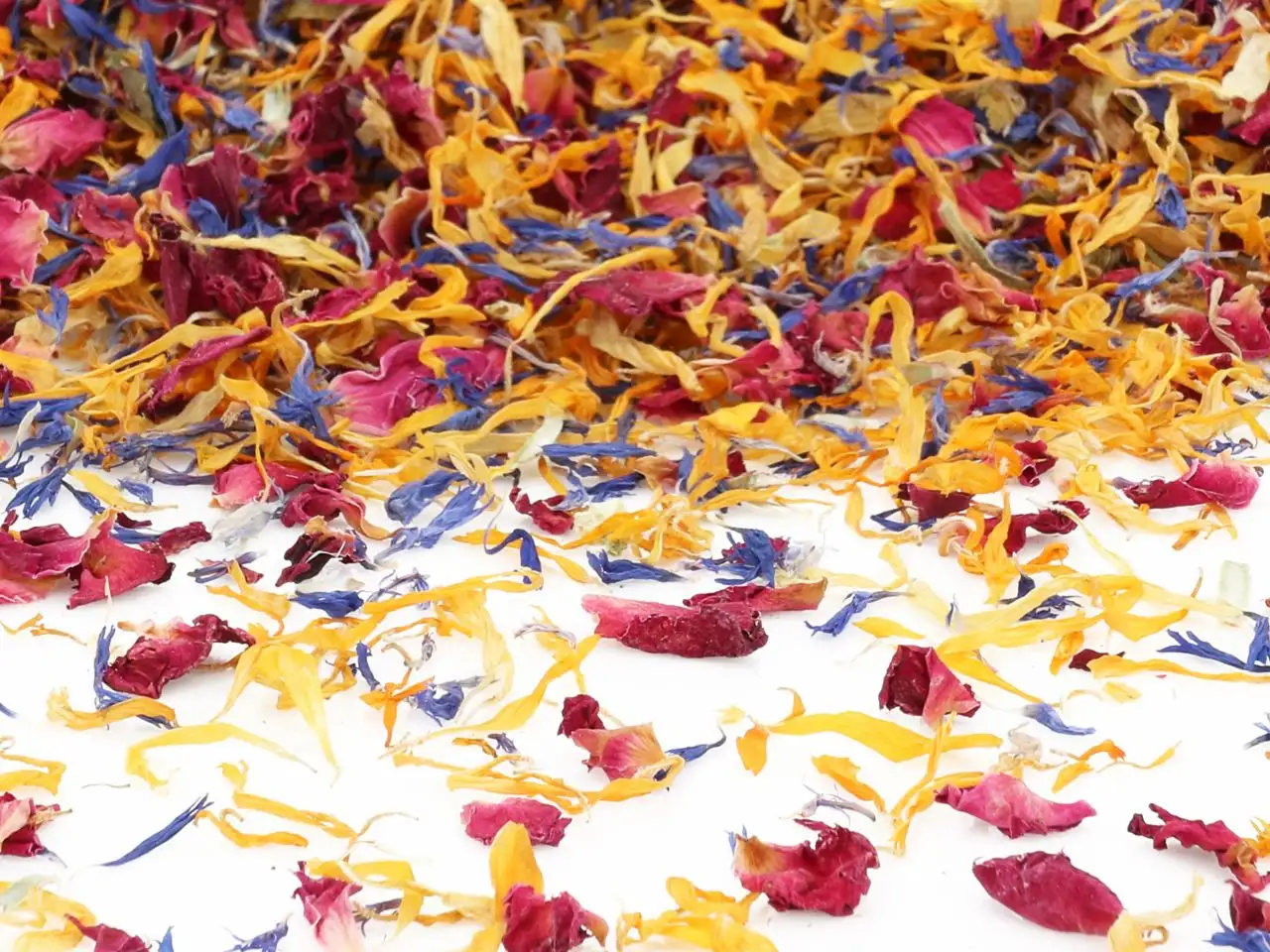 Ehető szárított virágkeverék mályvavirágból, rózsavirágból, búzavirágból, körömvirágból, levendulából.