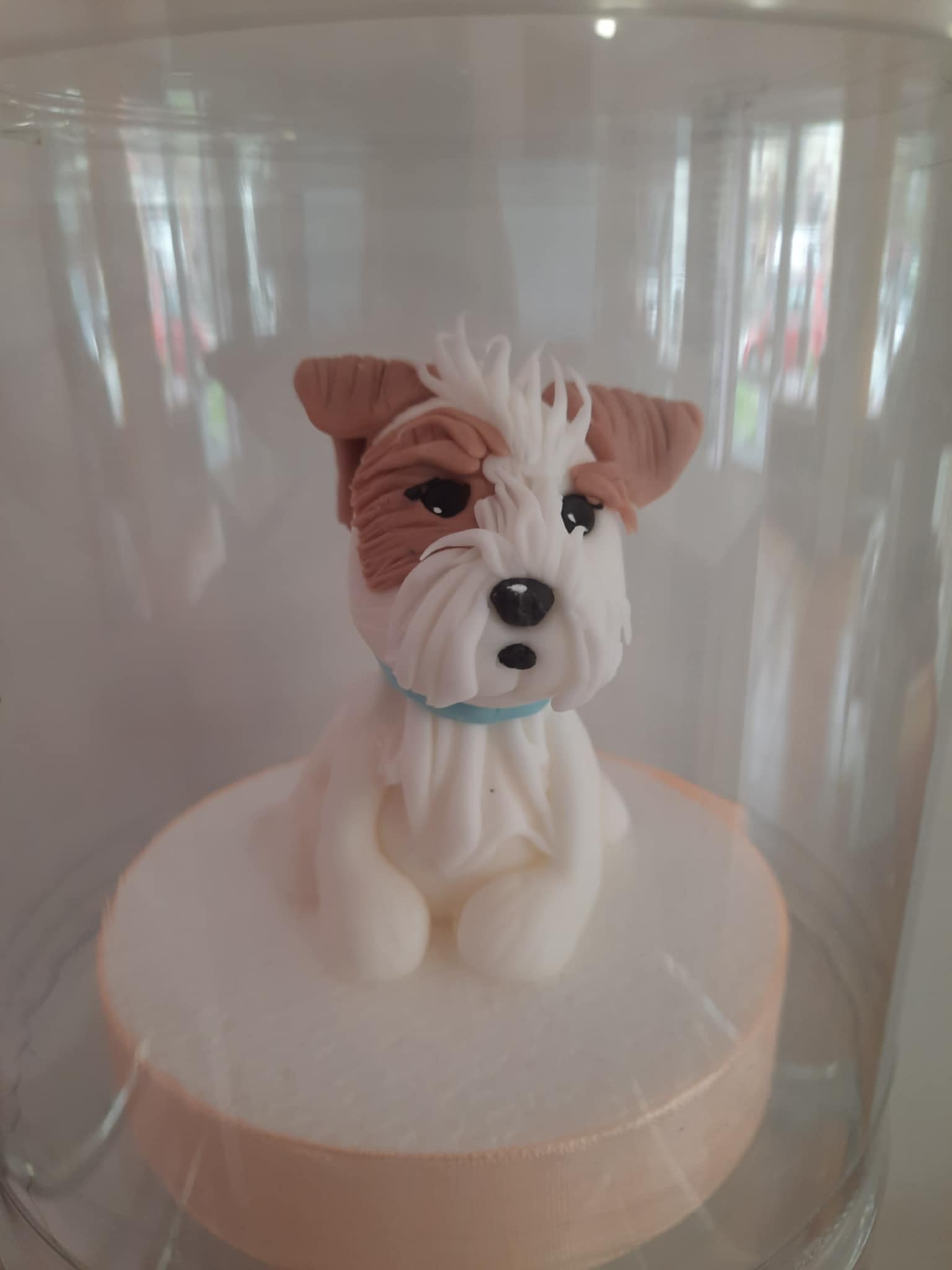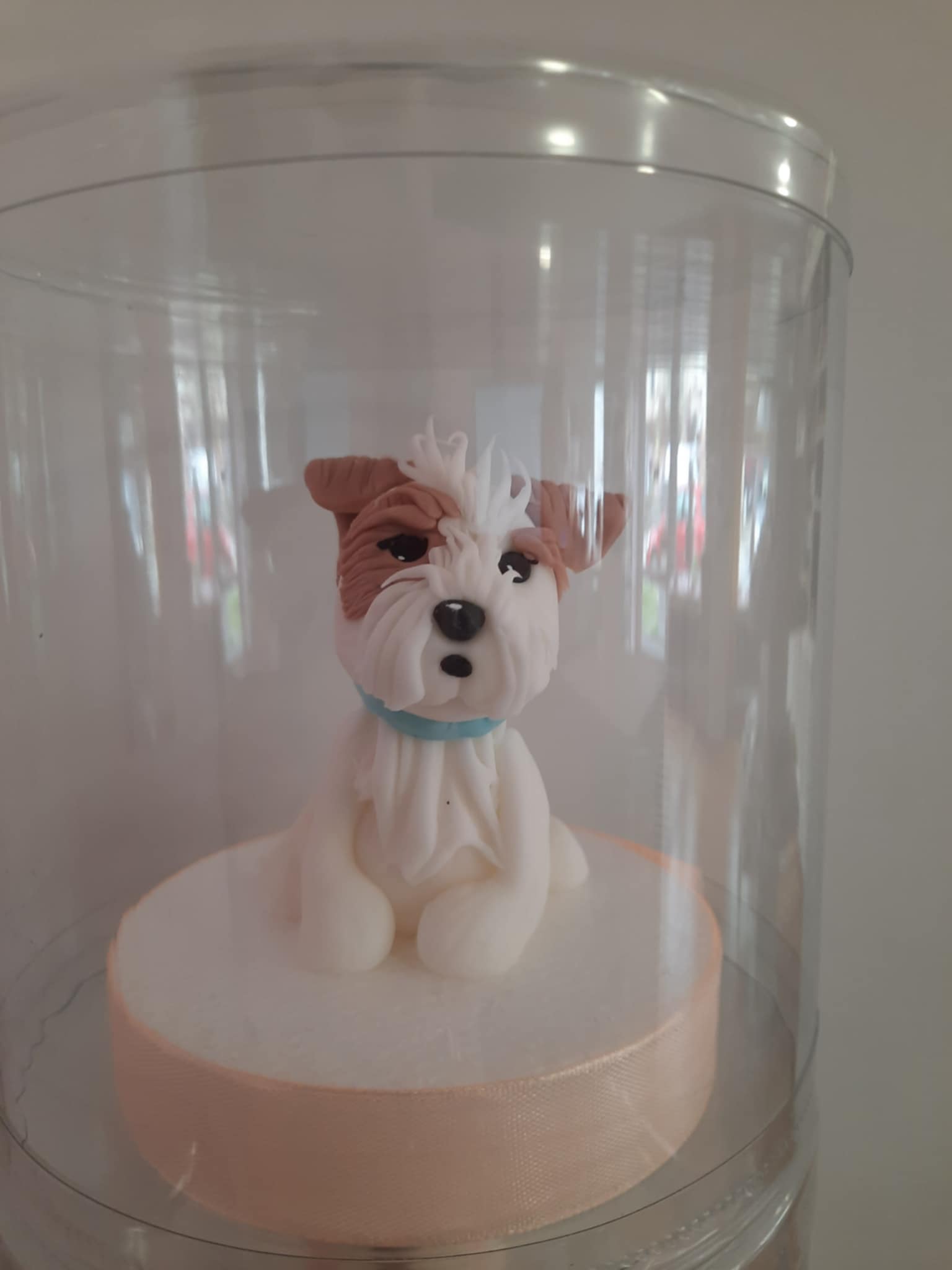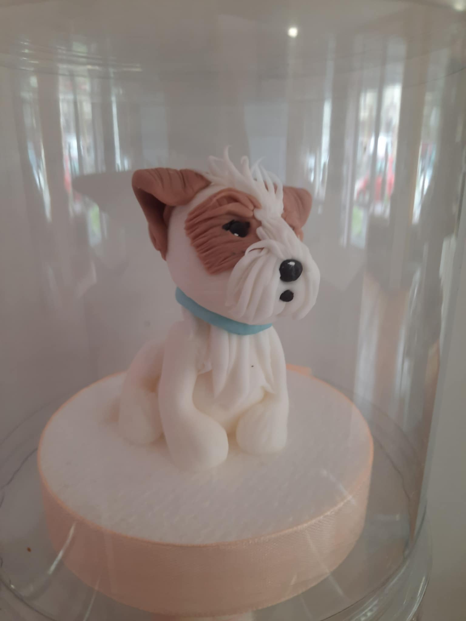 Nem ehető barna – fehérkutyus cukorfigura torták díszítéséhez.