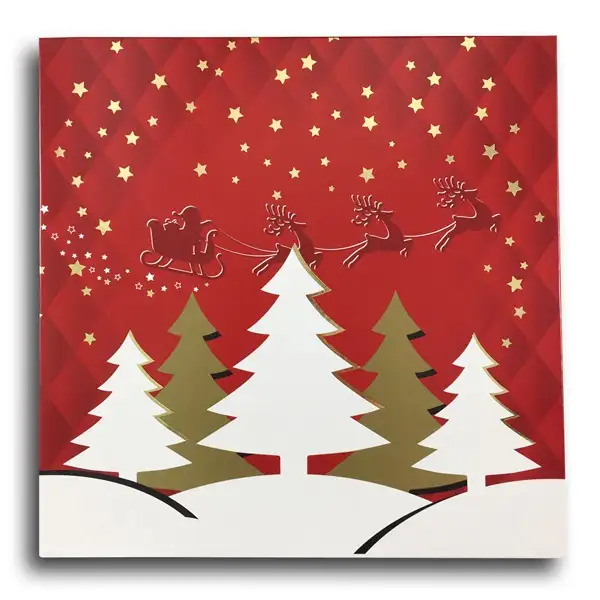 Karácsonyi süteményes doboz – Piros-fehér, karácsonyfák rénszarvas szánnal 22,7 x 22,7 x 6cm