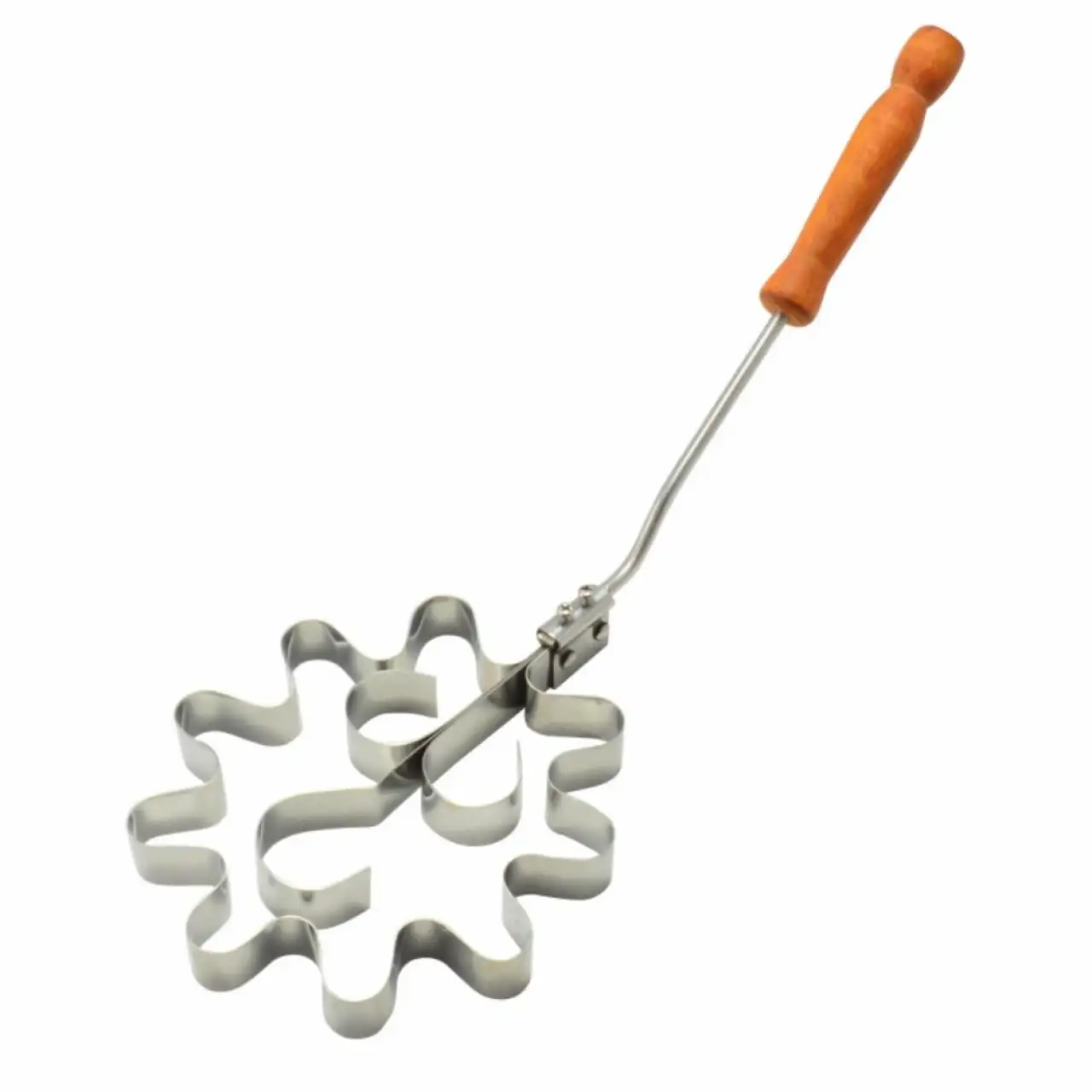 Mikor felforrósodott, a formát a tésztába mártjuk, majd a forró olajba vissza helyezzük.