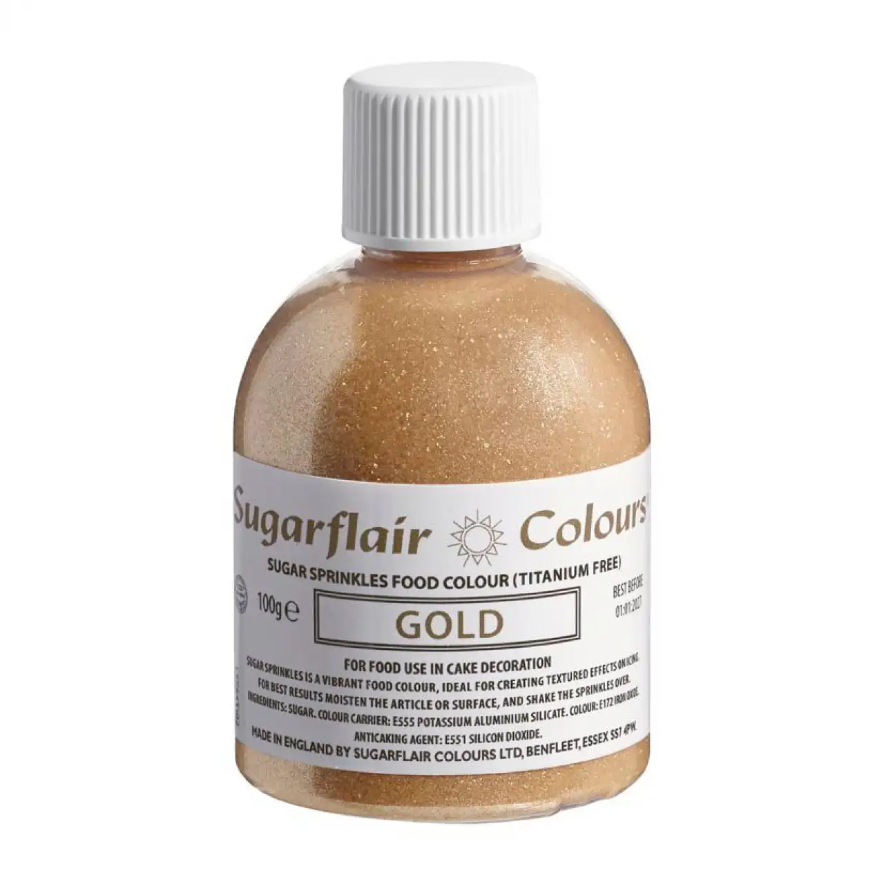 A termék apró cukorszemcsékből és csillogós arany csillámporból áll.