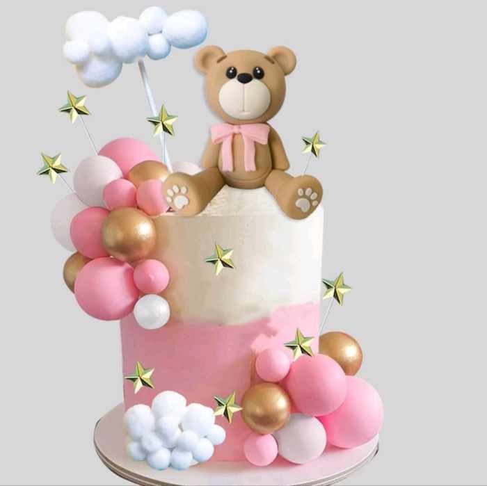 Rendkívül mutatós macis tortadekorációs szett és beszúrós tortadísz babaváróra vagy szülinapi partyra.