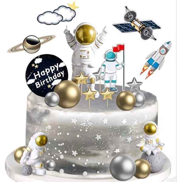 Rendkívül mutatós űrhajós tortadekorációs szett és beszúrós tortadísz fiúknak szülinapi partyra.